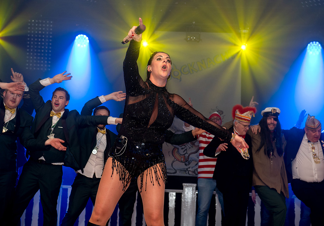 und seinem Vize Klaus Gerdes moderierten Bocknacht der KG ZiBoMo ablieferte, war Party pur. Mit ihrer Mixtur aus Schlagern á la Malle und rasanten Evergreens der Unterhaltungskunst, gepaart mit allerlei teils artistischen Tanzeinlagen brachte sie das Festzelt in wenigen Minuten auf den Siedepunkt. Und die Gäste der Herrensitzung dankten es ihr mit einer ausgelassenen Polonaise und bombastischer Bühnenbegleitung. „So viele Männer hatte ich ja noch nie hinter mir, ihr macht mich ganz wuschelig“, strahlte die 38-Jährige mit den angefixten Jecken um die Wette.
