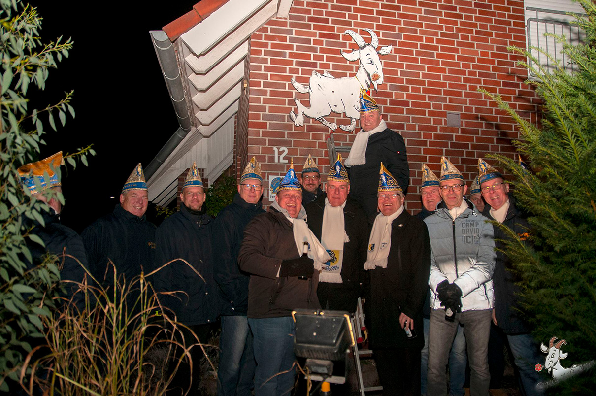 Ein letzter frostiger Gang war abschließend der Weg zu Hippenmajor Ralf I. und seinem Team, der die große Schar voller Vorfreude empfing. Wie auf den Stationen davor war auch hier alles bestens für eine schnelle Montage vorbereitet. So thront nun auch bei Ralf voller Stolz der große Ziegenbock auf der Hauswand.