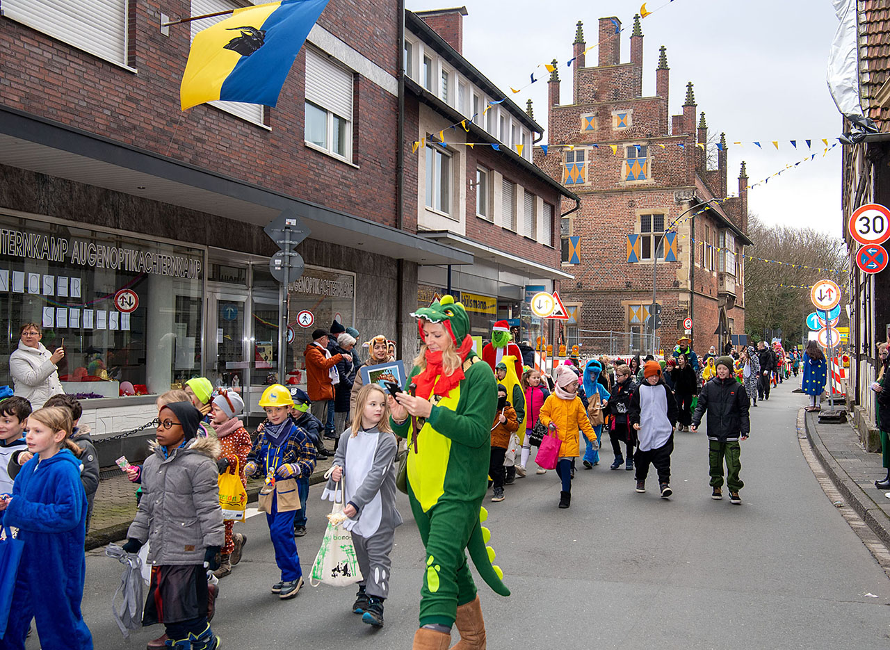 Jugendhippenmajorin Ania I. begleitet gemeinsam mit ihren Adjutantinnen Lena Wolbeck, Mareen Laumann und den ZiBoMo und zwei Tanzmariechen die Grundschüler*innen und Lehrer von der Nikolaischule aus. Die Wolbecker Jungkarnevalisten, kurz Jukas zusammen mit zwei weiteren Tanzmariechen unterstützten die bunt verkleideten Schulkinder der Grundschule Nord auf ihren Weg zum Treffpunkt am Achatiushaus.