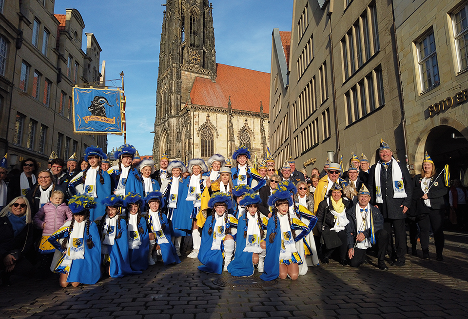 Es war wunderbar, zu sehen, dass die Stadt voller Narren war, aber auch die Shoppingqueens und -kings durchaus innehielten, um zu sehen, was dort vor sich geht. Angeführt von dem Spielmannszug der freiwilligen Feuerwehr reihten sich die Aktiven der ZiBoMo zwischen die vielen münsterschen Karnevalsgesellschaften, um in einem Sternmarsch auf den Prinzipalmarkt zu gelangen. Bei strahlendem Sonnenschein und leuchtend blauem Himmel bot sich ein wunderbares Bild.An der Bühne vor dem Rathaus wurden die Repräsentanten der Gesellschaften schwungvoll begrüßt und natürlich durfte bei unserem Eintreffen eine Aussage der Moderatoren nicht fehlen: „In Wolbeck ist gerade kein Mensch mehr, die sind alle hier“.